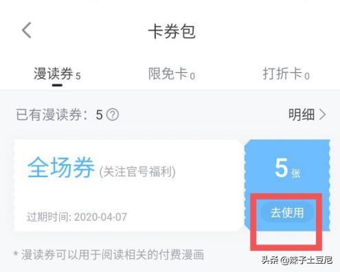 5、在卡券包里可以看到漫读券的数量,点击去使用,如下图所示。