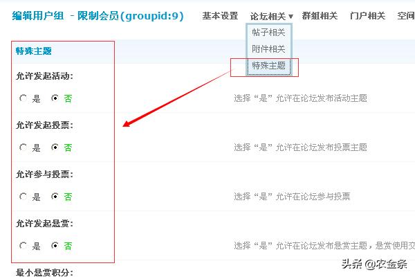 6、特殊主题设置,你不可能允许一个被限制的会员可以发布活动主题吧!所以也必须设置。