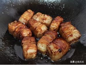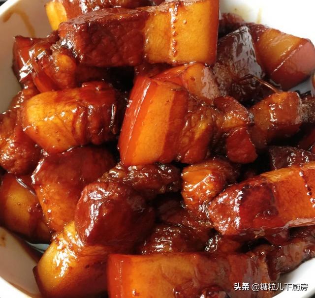 红烧肉的做法流派很多,有炒糖色的,有用红烧酱油的,《随园食单》里还特意提到说可以一斤肉、三钱盐,纯酒煨之。做得好的红烧肉应当肉色红如琥珀,入口瘦肉也能即化。而且焖烧过程中千万不要常起锅盖,否则肉质走油,味道都进汤里了,肉就不好吃了。起锅的时间也很重要,早了肉色还是黄的,晚了肉色由红变紫,瘦肉也变硬了,影响口感。做饭这事,全靠经验,搞了熟能生巧,没事多练练。