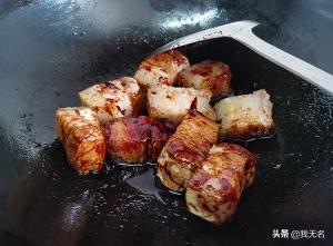 3.煮1个小时候后放入冰糖,调成小火不断地翻炒,直到肉起糖色,即可出锅。