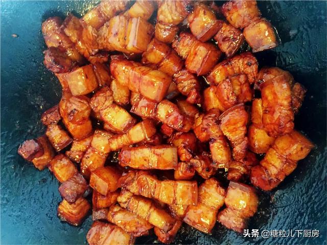 要选择五花三层的猪肉,洗净后沥干水分,切成两公分见方的块备用(不需要焯水)。