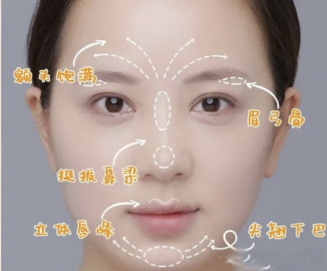 高光提亮:额头+鼻梁(T区),眉骨+颧骨(C区),眼下三角区,唇峰,下巴,这些都是需要高光提亮的地方。注意少量多次叠加,妆容更立体精致。